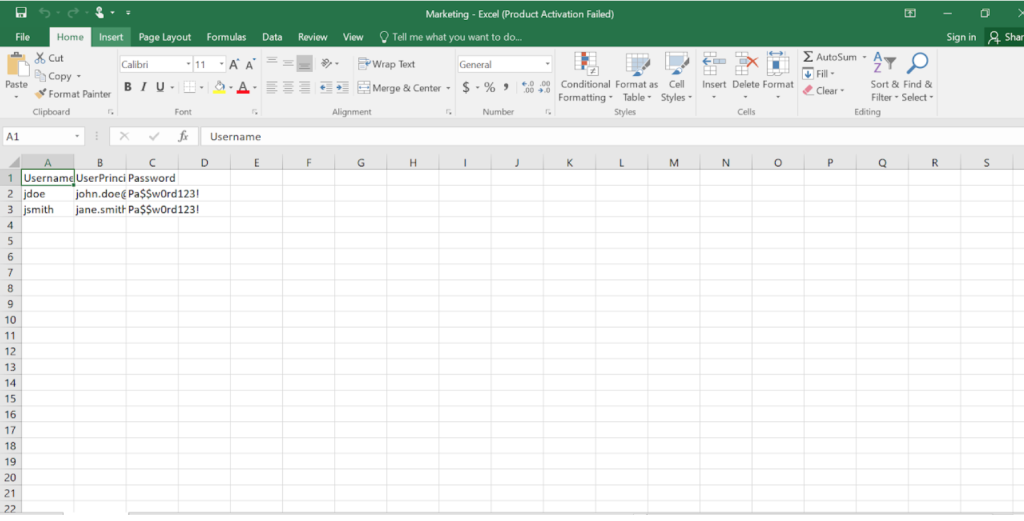 In this step, I created a CSV file that contains the username, password, and organizational unit for each user.