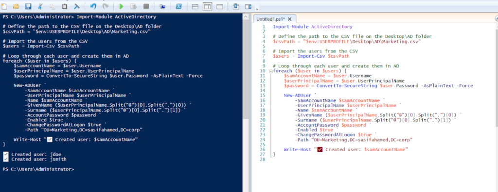 This project shows how I used PowerShell and a CSV file to automatically create user accounts in Active Directory.