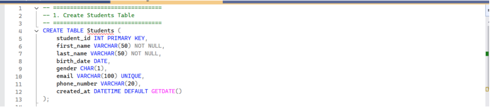 First, I created a table to store student information, including their name, birth date, gender, email, and phone number.