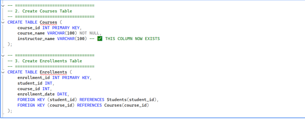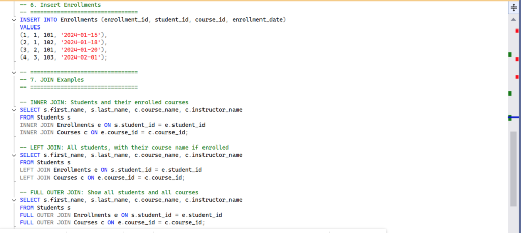 This part of the code shows how student and course data are connected using different types of joins. The INNER JOIN shows only students who are enrolled in courses. The LEFT JOIN lists all students, even if they aren’t enrolled in any course. The FULL OUTER JOIN shows all students and all courses, even if there’s no match between them