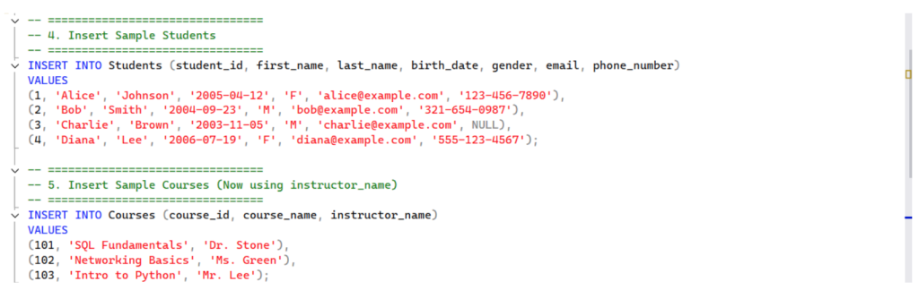 Next, I inserted 4 students into the Students table and 3 training courses into the Courses table, each with details like names, contact info, and instructors. This helps set up initial data for testing or demonstration.